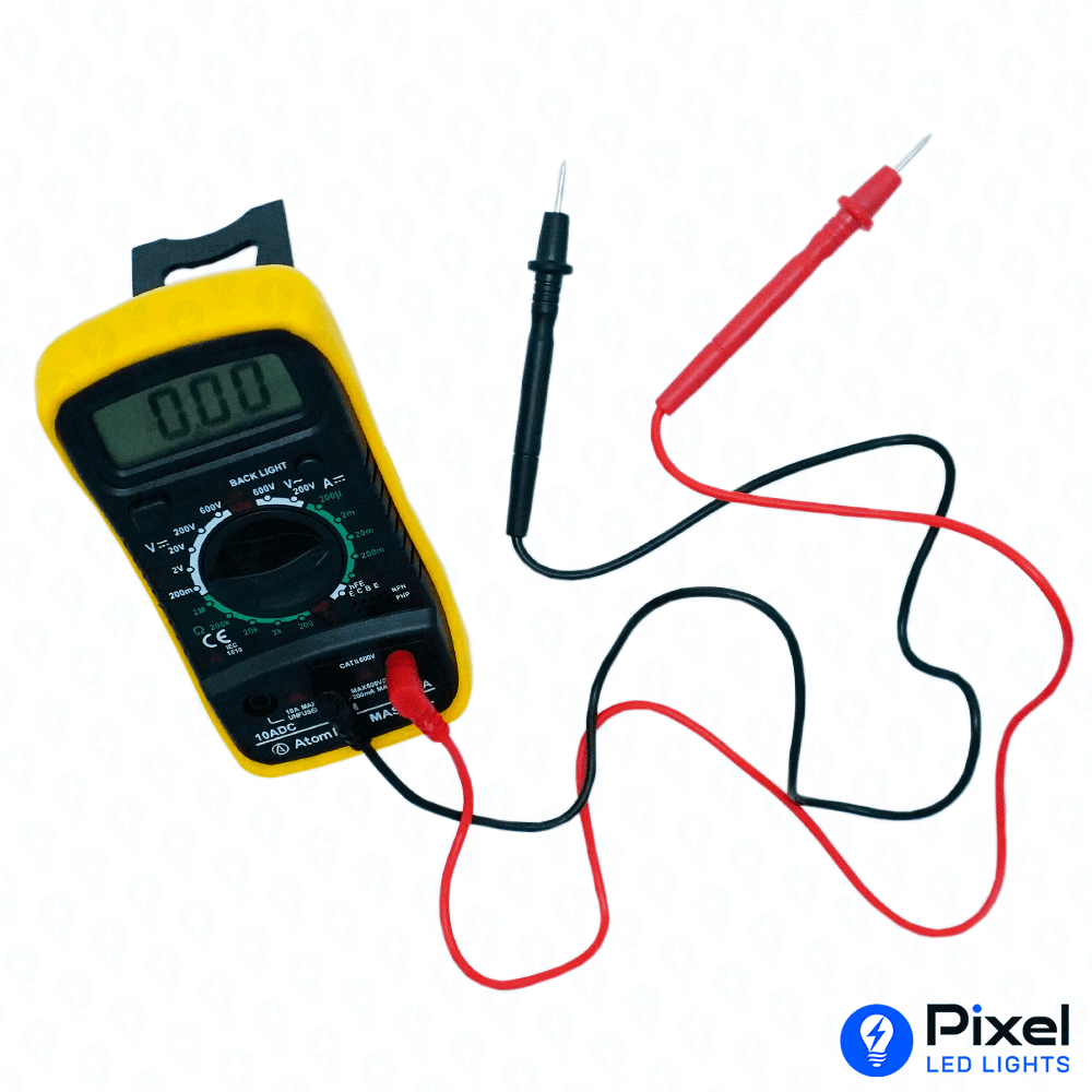 The MAS830L Digital Multimeter is a dependable and easy-to-use tool designed to measure AC/DC voltage, DC current, resistance, and perform continuity and diode tests. Its compact size, protective rubber casing, and clear LCD display make it an essential tool for Pixel LED installers, electricians, hobbyists, and students.